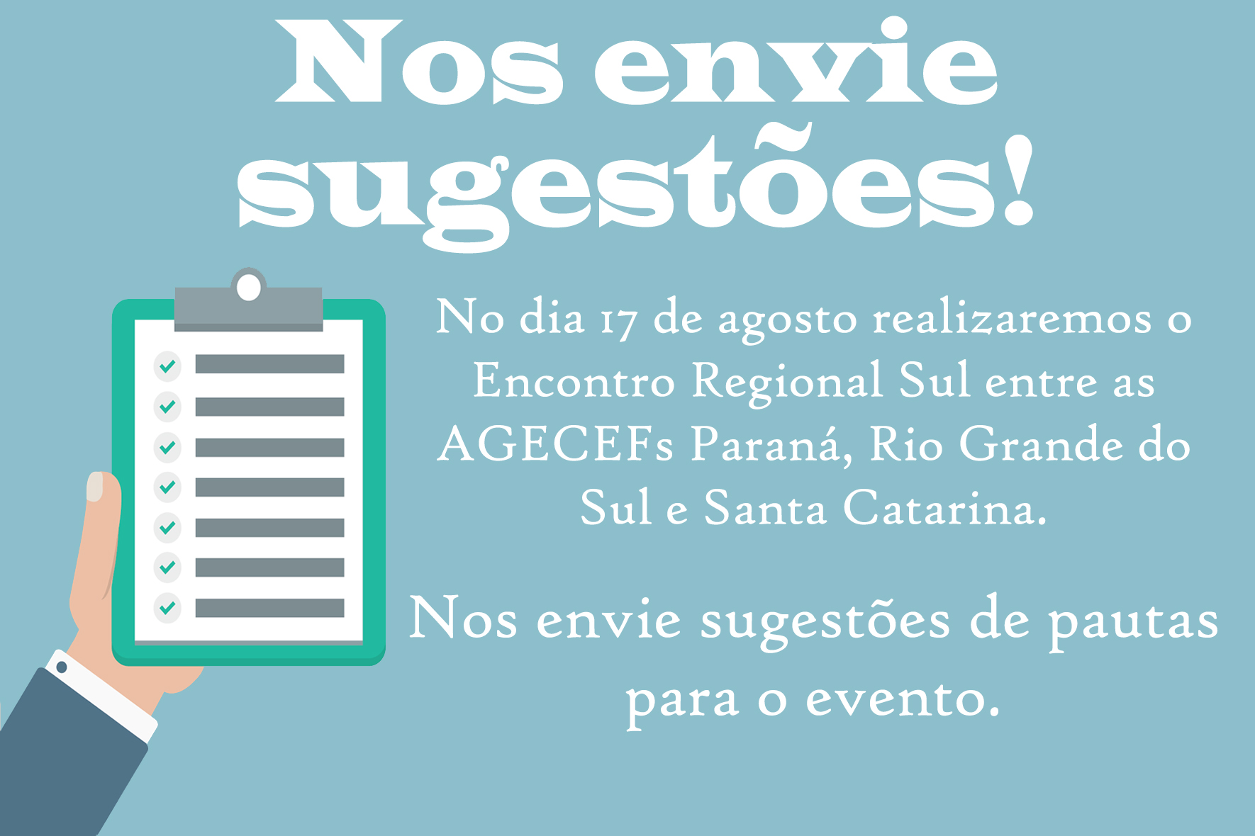 Encontro Regional Sul No dia 17 de Agosto as AGECEFs da região Sul se reunirão para o Encontro Regional Sul, tens alguma sugestão de pauta que você gostaria que fosse discutido nesse encontro? Mande sua sugestão! Toda sugestão é bem vinda!